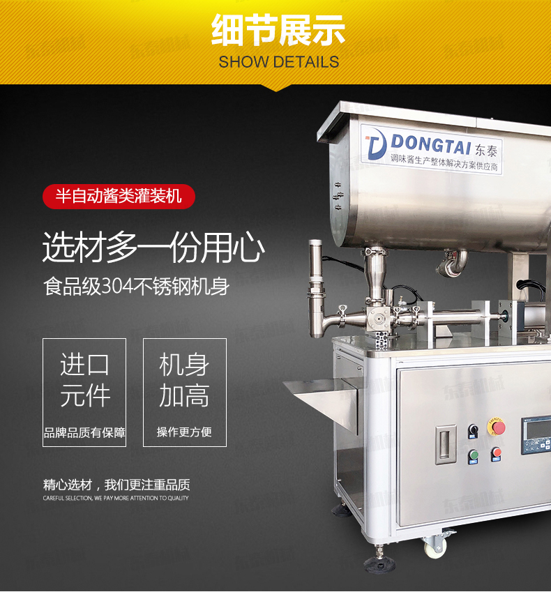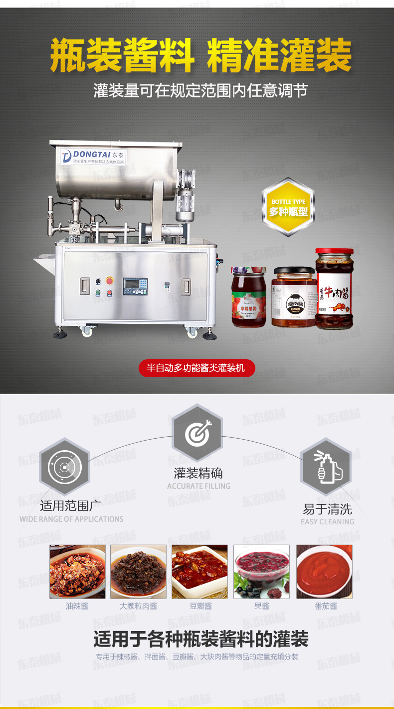 半自動灌裝機械,配置的自動攪拌器,保證了醬和油的充分混合,可灌裝顆粒漿狀流體物料在對辣椒醬、拌面醬、豆鼓等醬類進(jìn)行灌裝時,灌裝量可在規(guī)定范圍內(nèi)任意調(diào)節(jié),計量誤差小,該半自動醬類灌裝機采用壓縮空氣為動力可在各種環(huán)境中使用。