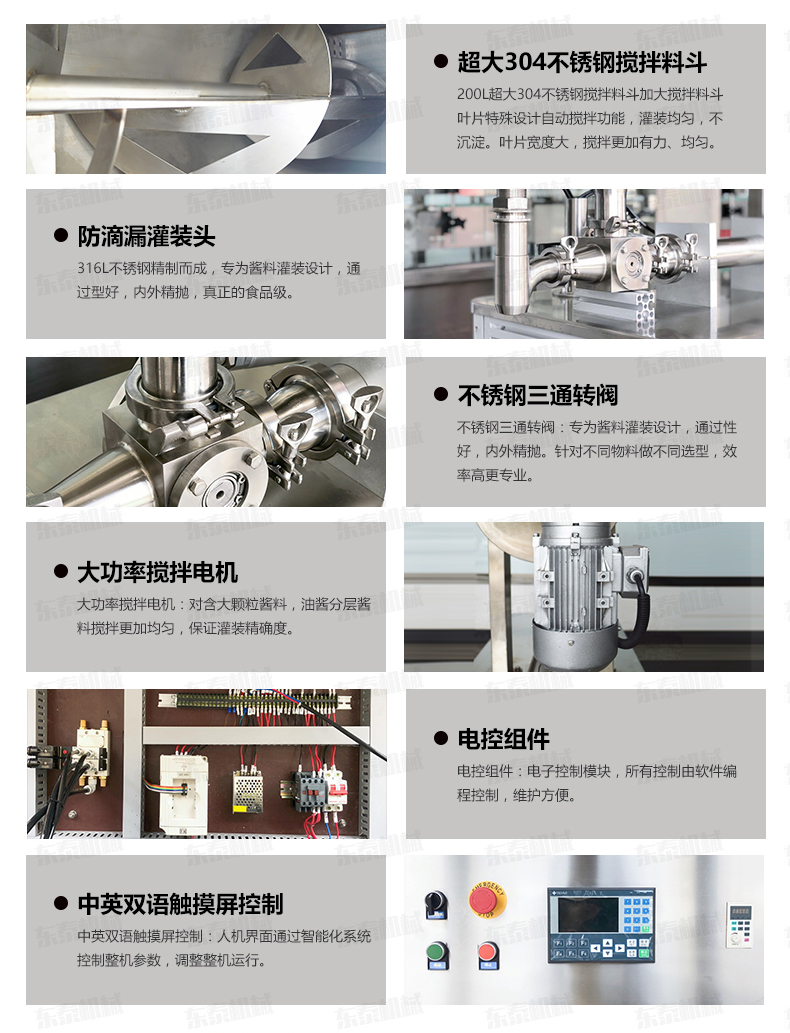 4.大功率攪拌電機:對含大顆粒醬料,油醬分層醬料攪拌更加均勻,保證灌裝精確度