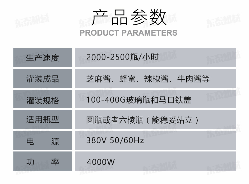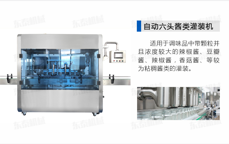 該系列灌裝機(jī)采用活塞式氣缸驅(qū)動(dòng)原理,適用于調(diào)味品中帶顆粒并且濃度較大的辣椒醬、豆瓣醬、辣椒醬,香菇醬、等較為粘稠醬類的灌裝。灌裝轉(zhuǎn)閥可以根據(jù)客戶物料定做加大,以適應(yīng)不同客戶物料的灌裝需求。配備臥式攪拌料斗,大限度的保障在灌裝過(guò)程中物料均勻、無(wú)油醬分離。該設(shè)備在設(shè)計(jì)上大大縮短了下料斗到灌裝頭的灌裝距離,克服了含油量大的物料(如:含芝麻粒的辣椒油)在灌裝過(guò)程中出現(xiàn)的有些瓶油多,有些瓶醬多的灌裝誤差大的缺點(diǎn)。