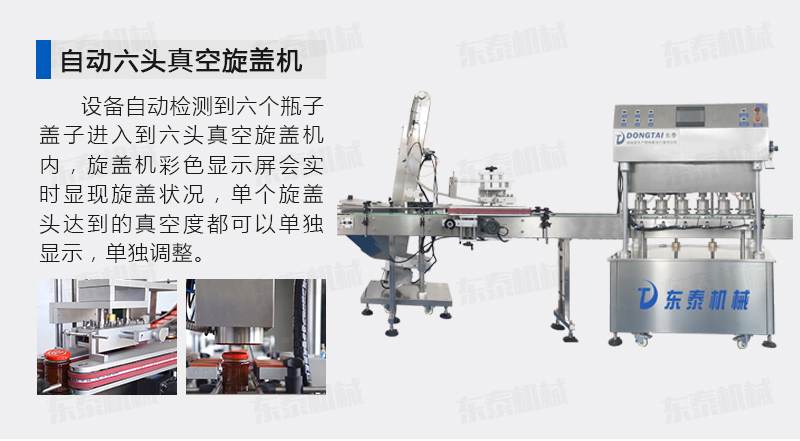 該直線式真空旋蓋機(jī)是東泰機(jī)械結(jié)合用戶使用的情況,摒棄了傳統(tǒng)轉(zhuǎn)盤(pán)式真空旋蓋機(jī)的弊端,研制開(kāi)發(fā)的設(shè)備,設(shè)備自動(dòng)檢測(cè)到六個(gè)瓶子蓋子進(jìn)入到六頭真空旋蓋機(jī)內(nèi),旋蓋機(jī)彩色顯示屏?xí)䦟?shí)時(shí)顯現(xiàn)旋蓋狀況,整機(jī)多點(diǎn)檢測(cè),當(dāng)進(jìn)口無(wú)瓶無(wú)蓋、出口堵塞、定位不準(zhǔn)、瓶身傾倒均自動(dòng)停機(jī)。單個(gè)旋蓋頭達(dá)到的真空度都可以單獨(dú)顯示,單獨(dú)調(diào)整!