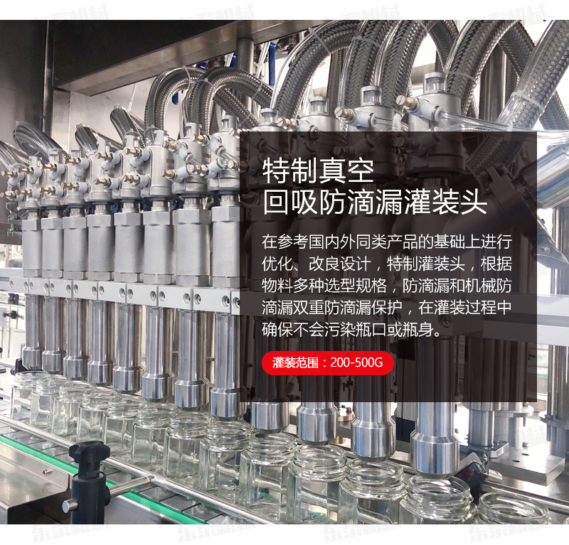 3、灌裝機(jī)采用橫推料的方式,大大縮短了下料斗到灌裝頭的距離,提高了灌裝速度,更重要的是解決了含油量大的物料在灌裝過(guò)程中出現(xiàn)的有些瓶油多,有些瓶醬多的灌裝難題,大大提高了灌裝精度。