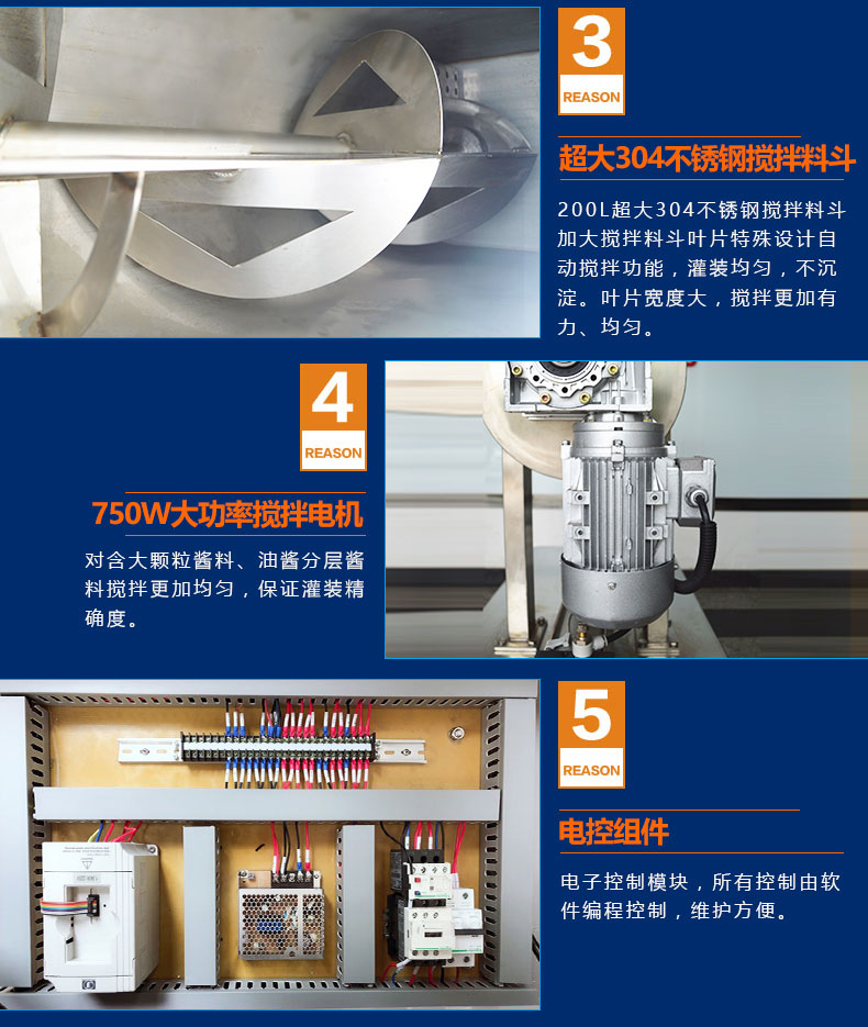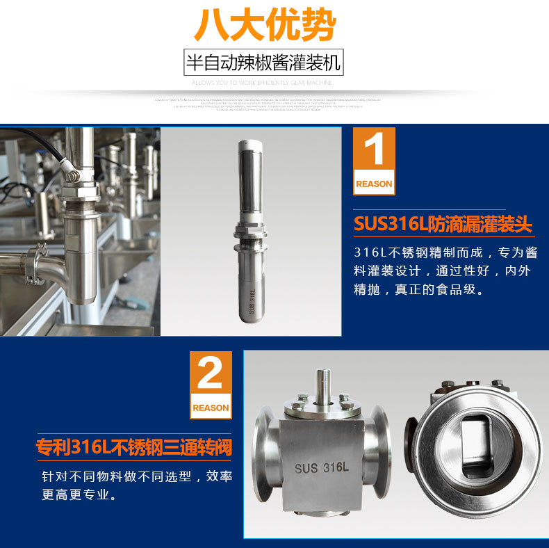 產(chǎn)品簡介:半自動醬類醬料灌裝機SFM系列結(jié)構(gòu)合理、機型小巧、性能可靠、定量準確、操作方便。整機304不銹鋼,灌裝悶頭防漏料防滴油,氣缸驅(qū)動結(jié)構(gòu),加大200L料斗,品牌全鋁殼銅芯大功率攪拌電機,變頻調(diào)速,PLC智能控制,用戶可根據(jù)需要任意調(diào)節(jié)灌裝量及灌裝速度,灌裝精度高。